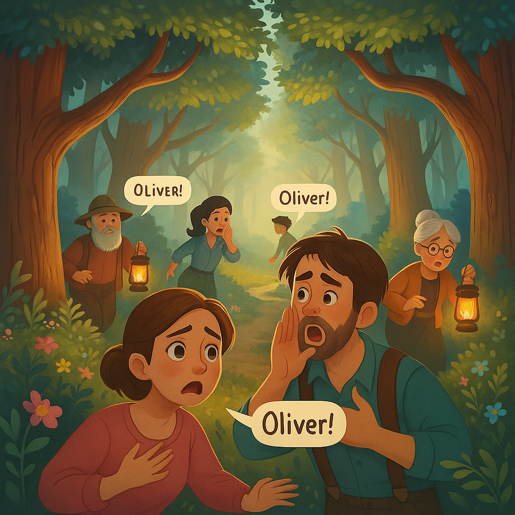Nel frattempo, Mamma Daino, guidata dalle voci degli uomini, si era avvicinata facendo rumore per attirare la loro attenzione. Quando gli uomini la notarono, decisero di seguirla. Lei li condusse fino al punto in cui si trovava il piccolo Oliver, sano e salvo. La felicità dei genitori fu immensa e, tra baci e abbracci, rimproverarono affettuosamente il figlio per essersi allontanato, facendogli promettere che da quel momento in poi avrebbe ascoltato le loro raccomandazioni.