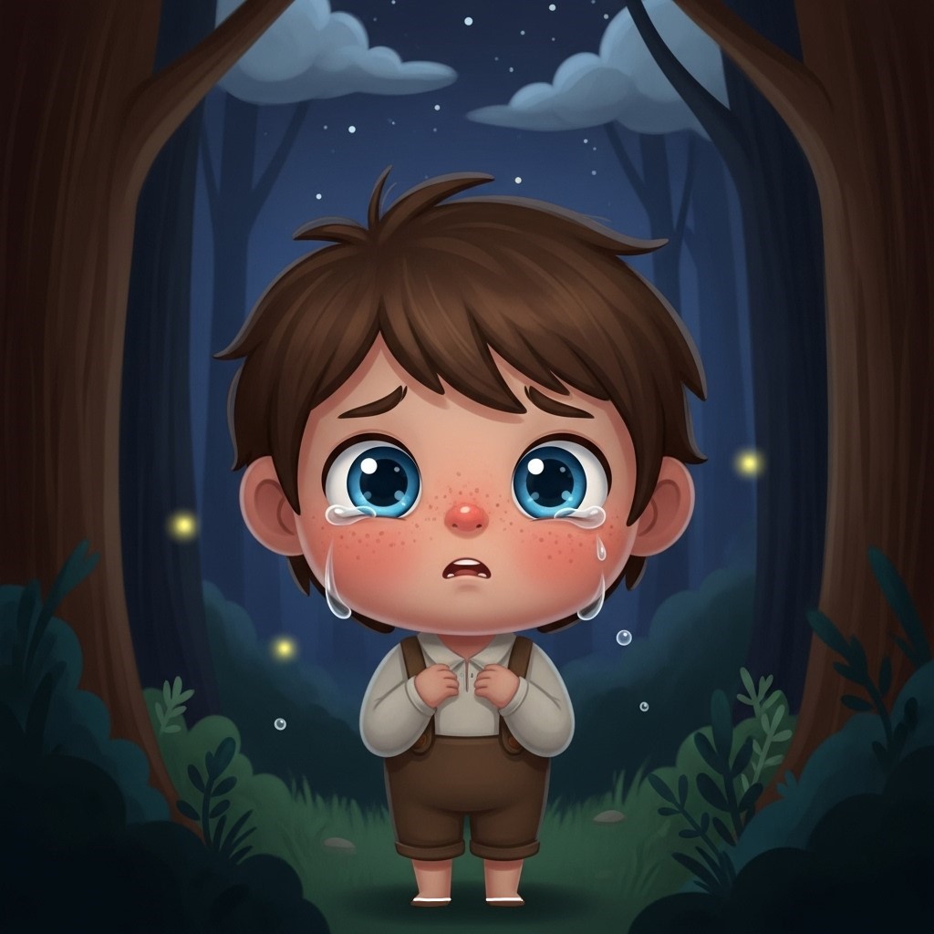 Mentre il sole calava e la luce si affievoliva, il bambino continuava a vagare senza trovare la via del ritorno. I cuccioli di daino, sempre silenziosi, lo seguivano da lontano, preoccupati. Alla fine, il piccolo umano scoppiò in un pianto disperato, e Stella suggerì di andare a cercare Mamma Daino per chiedere aiuto.
