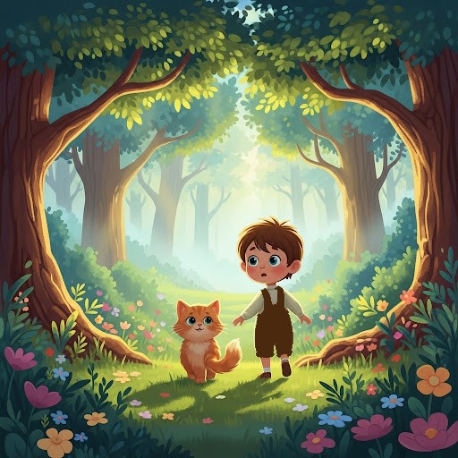 Cerbi, sempre prudente, cercava di frenare i fratelli: “Mamma ha detto di non uscire dal bosco!” Ma Palla, il più intraprendente, rispondeva: “Diamo solo un’occhiatina!” E così, si avventurarono verso il bordo del bosco. Quel giorno, mentre giocavano, notarono un cucciolo di Due Gambe inseguire un gattino nel bosco. Restarono immobili, osservandolo da lontano.