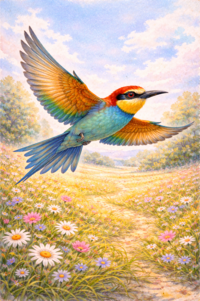 La piccola Alis, però, non si arrese. Volò altissimo, oltre le nuvole nere, e vide che lassù il sole splendeva ancora su un prato asciutto e pieno di frutti. Tornò giù e chiamò gli amici: “Dobbiamo aiutarci! Se uniamo le forze, riusciremo a volare oltre la tempesta!”