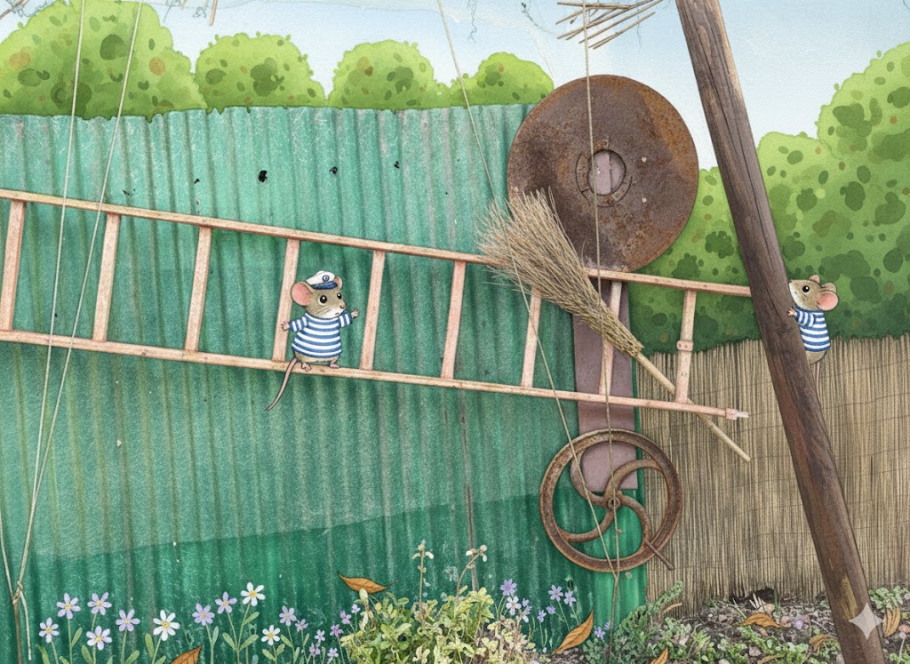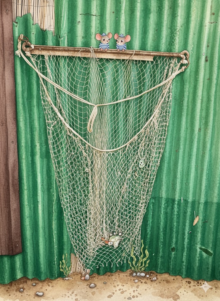 L’immaginazione deindue topini vola verso la rete appesa nel capanno antistante .Come marinai esperti ,la usano per intrappolare alghe marine ,qualche granchio e pesciolini vari.